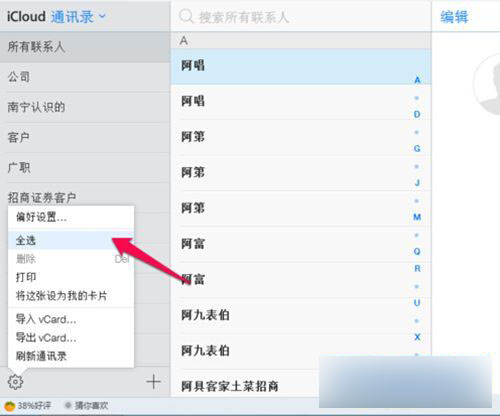 4)然后点击在选择【全选】所有通信录,然后再按一次设置按钮,选择删除。再次确认删除,这样子就清空手机里面的通信录啦!(如下图所示)