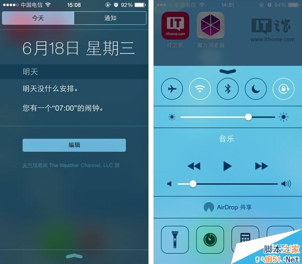 苹果一向是喜欢从越狱社区汲取设计源泉,iOS7和iOS8更是让许多第三方应用和越狱插件失却了存在的价值。下图是iOS8 Beta2的通知中心和控制中心,你能说出来他们的改变在向那些越狱插件致敬么?
