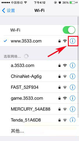 2)点击需要修改的WIFI链接后面的【i】按钮。(如下图所示)
