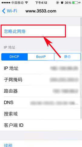 3)进入后选择【忽略此网络】即可,然后大家重新点击需要链接的WIFI,重新输入新密码即可使用了。(如下图所示)