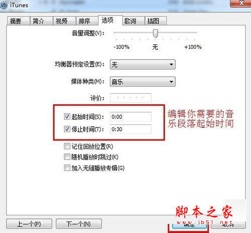 用鼠标右击歌曲,弹出来一个框,点击“显示简介”按钮,再选择“选项”,进入选项后, 将“起始时间”和“停止时间”前划勾,再将停止时间改在40秒以内,点击下边“确定”按钮。
