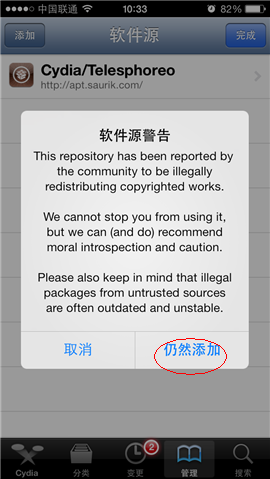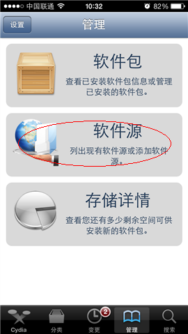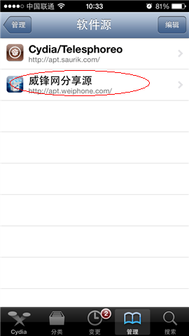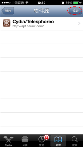 打开 Cydia ,点击下方的管理,找到相应的源。