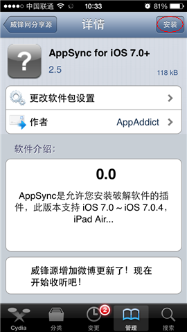 找到插件之后点击插件的名字进去,点击右上角的安装,进入安装界面之后点击确认,插件就开始下载安装了,安装时不要动设备,直至提示你回到 Cydia 即可。请看下面几张操作图: