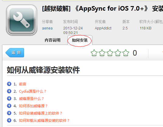 最后再告诉一个大家了解源的方法,在浏览器中输入:威锋源地址(点击跳转)。随便进入一个游戏/软件/插件/铃声中,点击“如何安装”就可以看到源的介绍、安装方法、卸载方法。请看下图:
