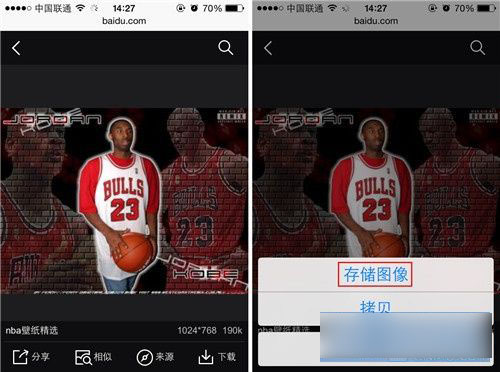 2)找到自己喜欢的图片后,长按该图片,这时系统会弹出一个菜单,在菜单选项中选择【储存图像】就可以保存该图片至相册了。(如下图)