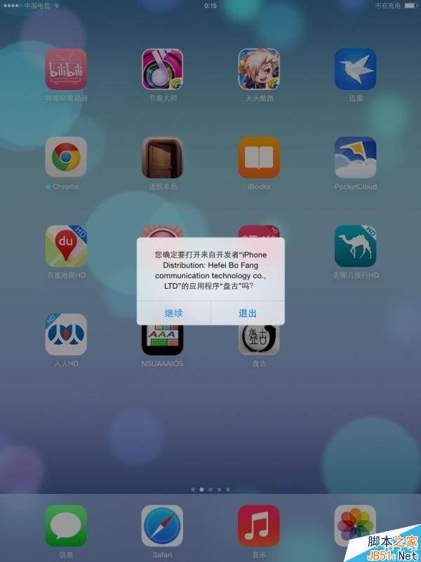 7.解锁设备,看到桌面上有盘古图标,点击图标,会提示一个警告框,点继续。