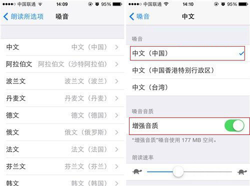 三、这里值得一提的是,iPhone语音功能支持多种语言类型,用户还可以在第二项“嗓音”中选择朗读的语言,基本上世界上比较主流的语言都覆盖了,当然我们这里选择的是中文,如下图所示。
