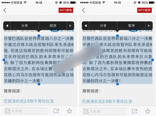 四、开启iPhone文字朗读辅助功能后,我们可以打开短信或者在浏览器中,找到一篇新闻文章,然后选择需要读取的文字,接下来旁边会有一个朗读按钮,我们点击后,即可自动听到Siri朗读文字了。