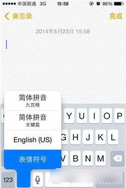 第四步、完成后,小编选择用备忘录来做测试。首先,用户打开备忘录并调出虚拟键盘,再长按左下角的小地球图标来切换输入法,然后就可以切换至简体拼音、简体拼音、表情符号等。