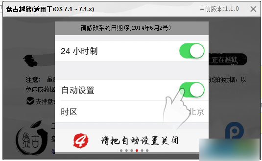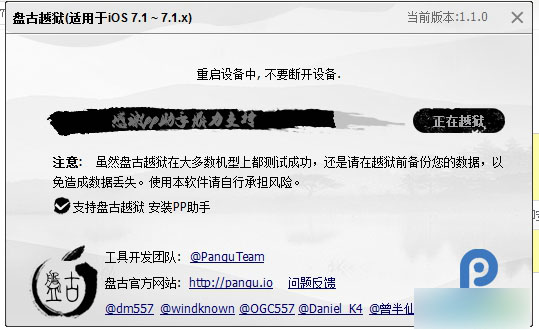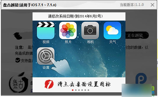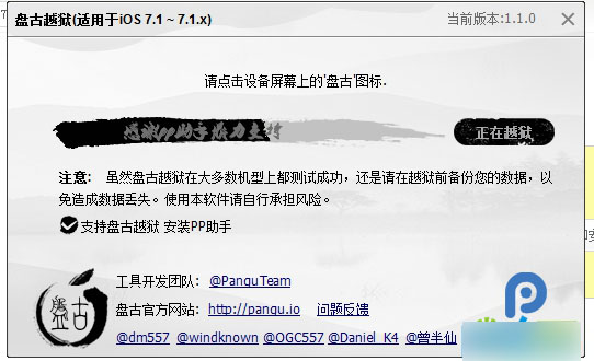 第三步、点击设备上的“盘古图标”继续越狱过程。