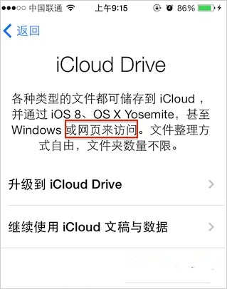在WWDC 发布会上,苹果宣布 iCloud Drive 可以通过 Mac、iOS 或 PC 进行访问。在今天发布的 iOS 8 Beta 3中,有页面显示用户可以通过网页访问 iCloud Drive,这意味着 iCloud Drive 会更灵活。相信不久之后苹果就会更新 iCloud.com,增加查看 iCloud Drive 文件的功能。目前,iCloud.com 网页只能访问 iWork 相关的文档。iCloud Drive 的实现方式可能也会采用相似的方式。