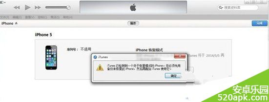2、iTunes会自动检测到一台等待恢复的设备,点击确定;