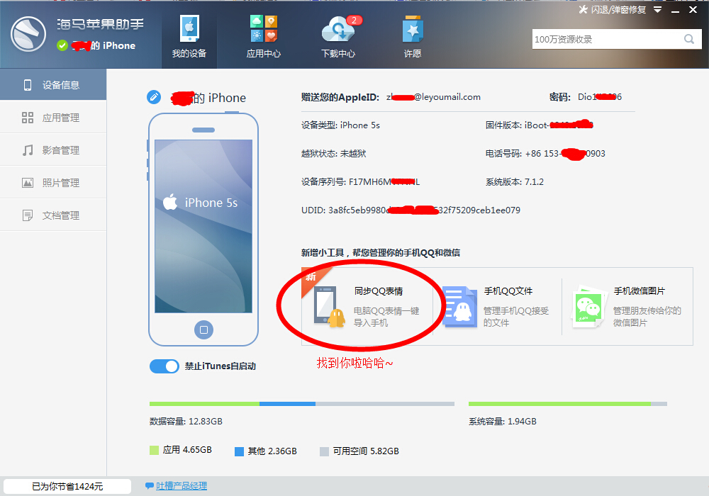 iPhone手机不能直接将图片添加到表情里。但可以选择照片里的图片直接发送给对方。当然也可以通过第3方软件工具把动态图片QQ表情导入到iPhone QQ中。下图是通过海马苹果手机助手无需越狱把电脑上搞笑的QQ表情导入到手机中。