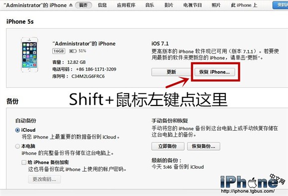 3.使你的设备进入恢复模式或DFU模式(恢复模式或DFU模式进入方法见本文下方),按住电脑键盘Shift键(Mac电脑按住option),然后用鼠标点iTunes上恢复键。选择固件,开始恢复。