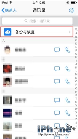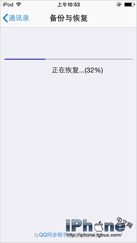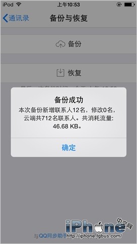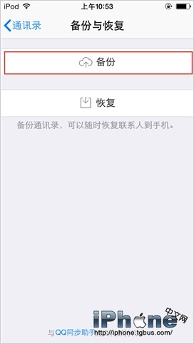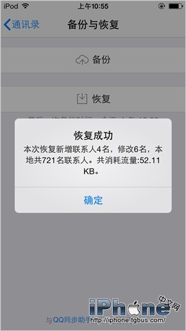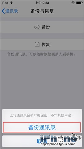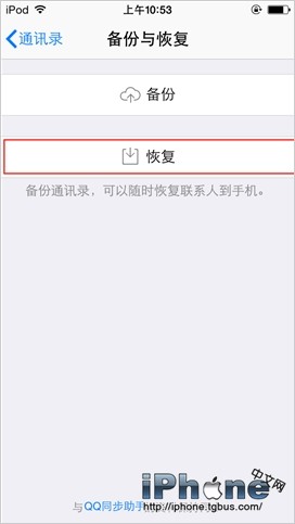 4.按照同上步骤,在新的iPhone5s活其他设备上,选择“恢复”,就可以将云端的通讯录备份直接导入新的设备内。