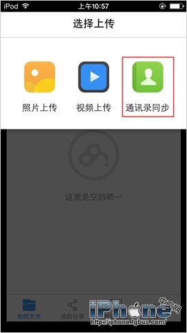 5.百度网盘和QQ类似,也需要先从原有设备上传云端,对通讯录进行备份。点击“上传”,然后点击“通讯录同步”,随后即可进行同步