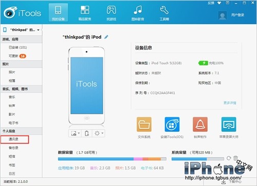1.我们以iTools备份短信来举例,首先打开iTools连接旧设备,可以在我的设备中看到个人信息。找到“通讯录”,鼠标点击进入。