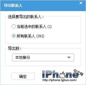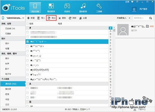 2.在通讯录中找到需要备份的个人、分组、或者选择全部备份。点击“导出”,即可将通讯录备份到PC上。