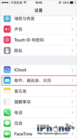 2.向下滑动,找到“邮件、通讯录、日历”的选项,点击进入。