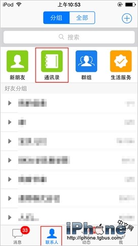 1.登陆QQ,点击下排联系人选项卡,找到上方通讯录,点击进入。