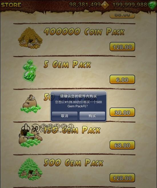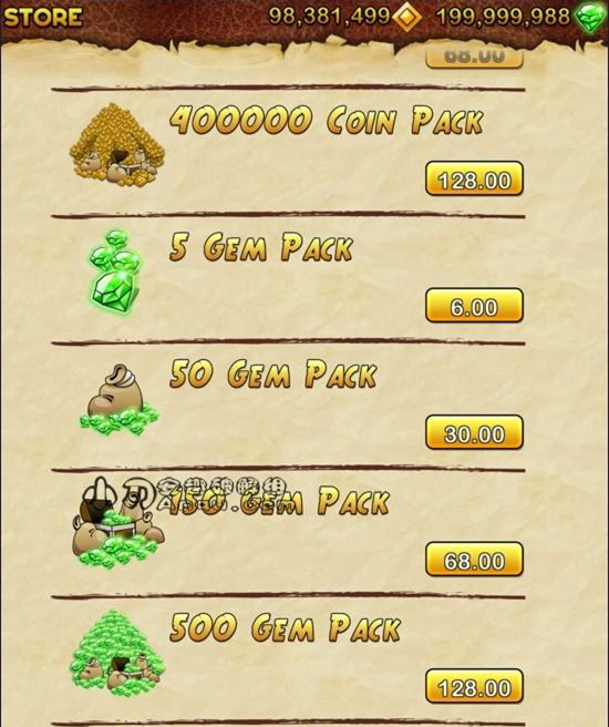 我们以神庙逃亡2这款游戏为例,进行内购,首先进入游戏的商店界面,如下图,发现有很多使用人民币购买钻石的选项,我们直接选择最贵的,也就是那个128元购买500绿宝石的,点击购买: