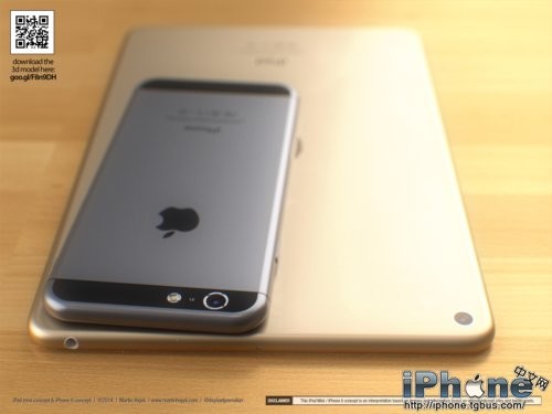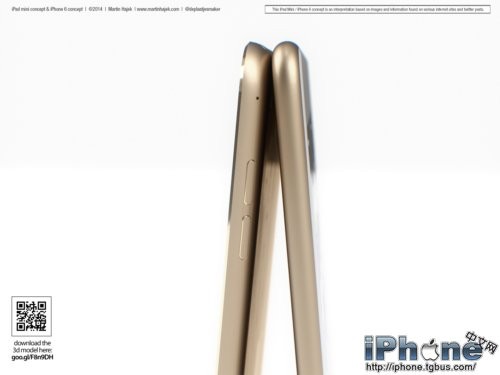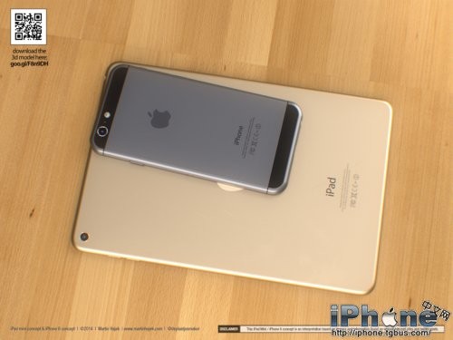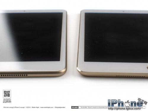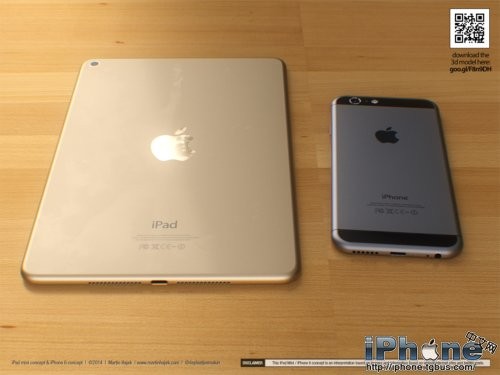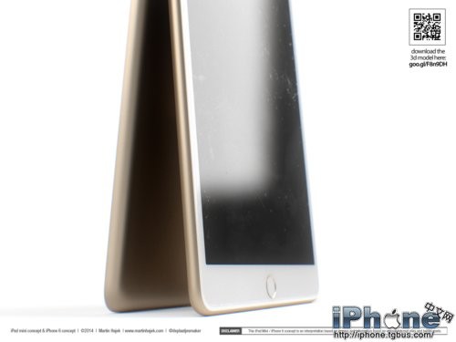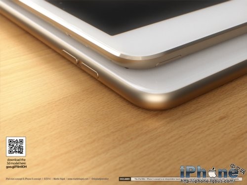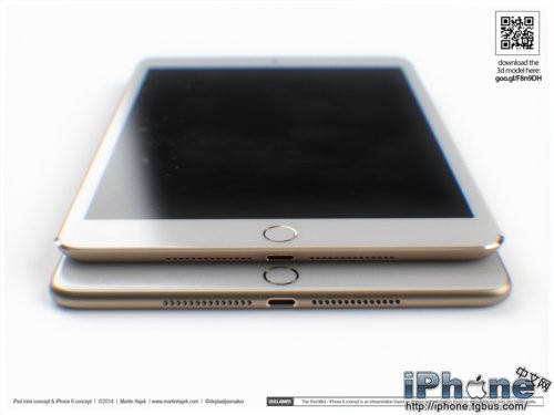 除了更为圆滑的边框之外,Touch ID当然也会是新一代iPad mini的特性之一。除此之外,Hajek还对iPad mini 3的侧边按键进行了调整,而且配上了非常流行的“土豪金”颜色。为了不让iPad mini太过孤独,设计师还在旁边摆放了一部基于谍照而设计的iPhone 6。再加上犀利的渲染技术,我们看到的iPad mini 2和iPhone 6都显得非常逼真。