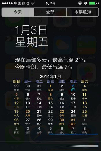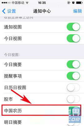 3)待安装后点击“设置”,然后进入“通知中心”。大家就能在通知中心看到“中国农历”的插件了,在“今日视图”里点击开启该“中国农历”即可。