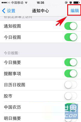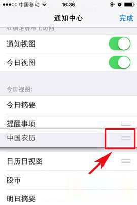 4)但很多人发现在通知栏里的日历位置太靠下了,想改变下通知栏里的显示效果。大家可以点击右上角的“编辑”按钮,然后手按住“三”的菜单进行上下拖动既可改变通知栏显示位置。