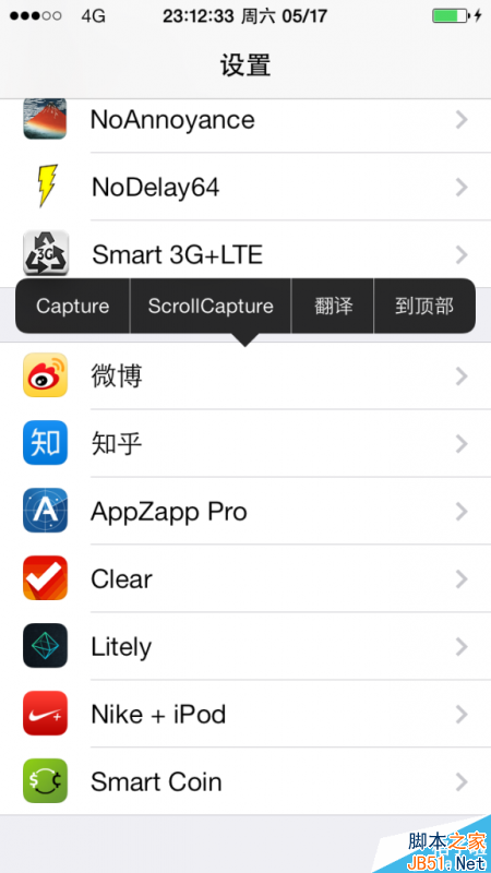 以截取“设置”为例,如果要单独截取蓝牙这部分,只需在“蓝牙”上长按,并在气泡菜单中选择 Capture 即可。如果要将“设置”完整地截取下来,可在长按后先点击气泡菜单最右侧的三角箭头,然后选择 ScrollCapture 即可。