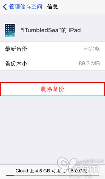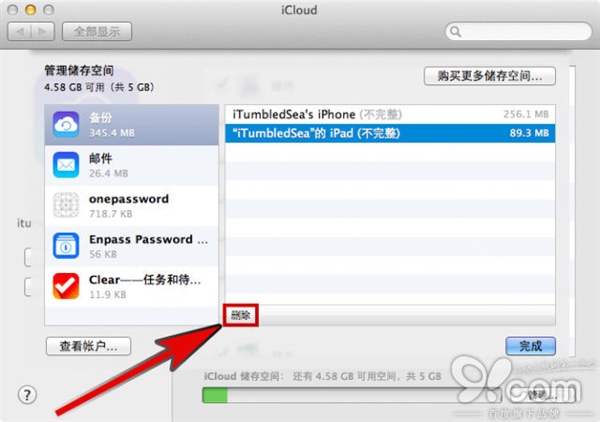 第五步:点击「删除」按钮(如图)。iCloud 设置面板将在上方弹出确认删除面板,点击「删除」来确认删除这一备份文件。