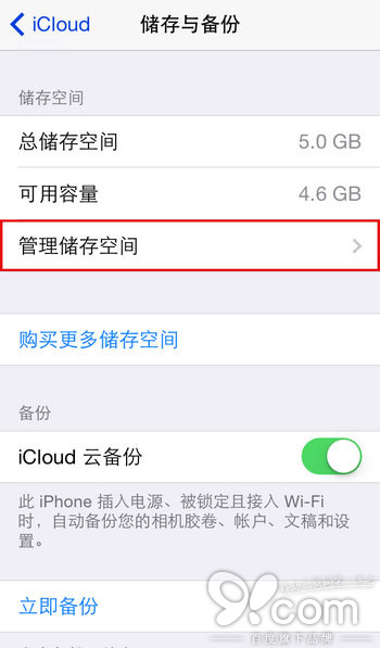第三步:在「存储与备份」界面选择「管理存储空间」选项。此时你会看到你所有的 iCloud 备份列表,选择需要删除的那个备份文件,点击它来查看该备份详情。