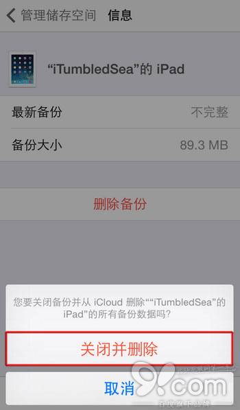 第四步:点击「删除备份」按钮,系统将在底部弹出一个确认面板,点击「关闭并删除」按钮来确认删除。
