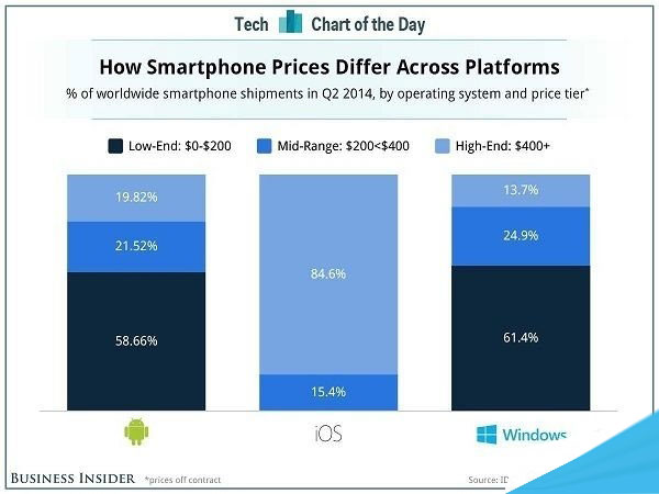 和苹果相比,Android和 Windows Phone 8 智能手机阵营采取的是完全不同的战略模式。他们大部分手持设备——60% 左右——的售价都是低于200 美元的。Android 和 Windows Phone 有 20% 的中端设备,而其中有一小部分是高端机,售价在 400 美元以上。