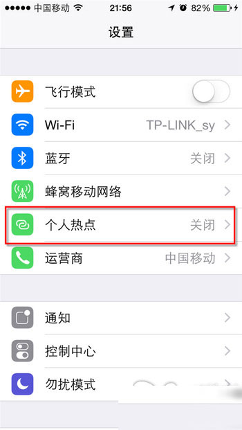 步骤1:在“设置”界面下点击“个人热点”选项进入。
