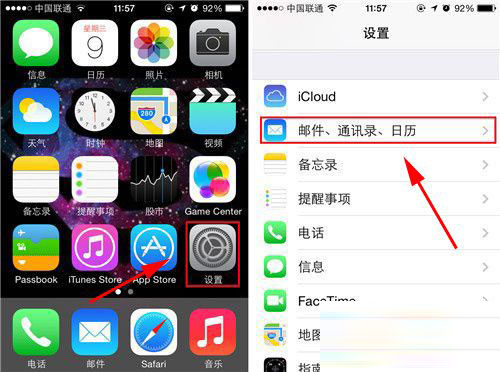 1)找到并打开iphone5s手机【设置】,点击【邮件、通讯录、日历】。(如下图)