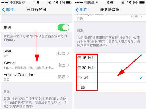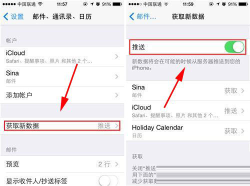 2)点击【获取新数据】,将【推送】选项激活。(如下图)