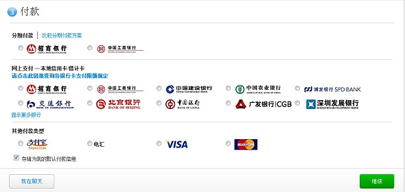 完善Apple ID的各项资料之后,在官网购买iPhone还需要准备相对应的银行卡才行。下图是目前苹果官网支持的银行卡信息,如果你恰好不是这些银行的话,在准备购机之前一定要做好准备。苹果官网还支持分期付款,不过支持的银行并不多,目前仅支持招商银行和工商银行。当然如果你绝对都不够方便的话,也可以使用支付宝直接付款。