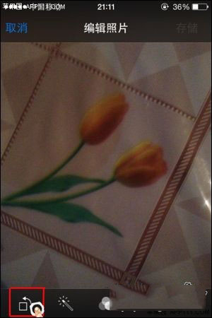 3、接着,照片下方会出现导航栏,在导航栏中点击最左边的旋转按钮(点击一下,即可将照片旋转90度),直到照片旋转至需要的样式。