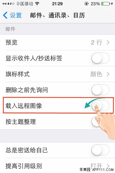 第二步,在“邮件、通讯录、日历”选项页面,关闭“载入远程图像”功能,即可。