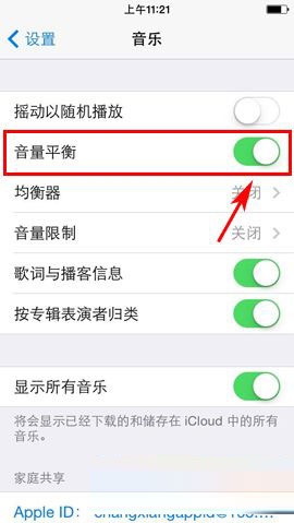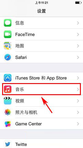 1)打开iPhone5s的设置,然后下拉页面找到并点击进入【音乐】,把【音量平衡】选项的开关打开即可。