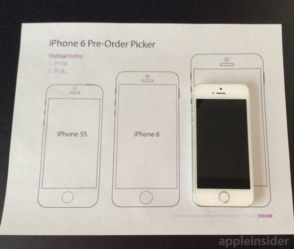 AppleInsider的一位读者打造了一个简单的“iPhone 6 Pre-Order Picker”(iPhone6预订选择器):这是一个PDF文件,展示了iPhone5s、iPhone6和iPhone6 Plus的图像。用户可以以100%的比例在8.5 x 11英寸的纸上将这些图像打印出来,这个“工具”便可以实际对比一下现有iPhone和iPhone6、iPhone6 Plus的尺寸大小,从而决定预订时到底选购哪个版本。