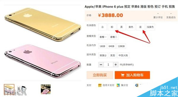 卖家还称,黄金色有白色屏幕和黑色屏幕,蓝色有白色屏幕和黑色屏幕,粉色只有白色屏幕,其价格比普通的iPhone 6要贵1000多元,另外还有24K镀金版,价格28800元。