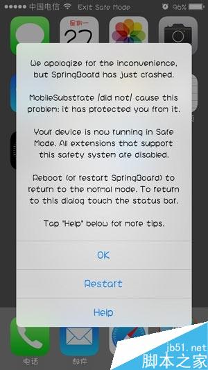 iOS8用户如果发现设备界面变成灰色,状态栏上显示“Exit Safe Mode”,并弹窗提示“We apologize for the inconvenience,but SpringBoard has just crashed. MobileSubstrate did not cause this problem:it has protected you from it.”那么“恭喜你”,你的设备已经进入安全模式。