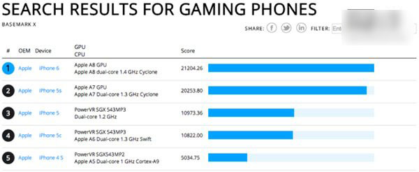iPhone6的1.4GHz双核A8处理器在Basemark X GPU测试中得分21204,iPhone5s的1.3GHz双核A7处理器同一测试的得分20254。