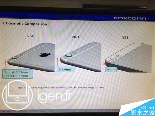 首先我们来看产品代号。4.7 英寸 iPhone 6 的代号为 N61,而 5.5 英寸版本则是 N56,我们还可以通过资料图看到 iPhone 5s 的代号为 N51。然后是产品的具体长度、宽度和高度:4.7 英寸 iPhone 6 的数据是 138 x 66 x 6.9 毫米,5.5 英寸型号则是 158 x 78 x 7.1 毫米,这里的厚度数据没有包含凸出的摄像头。作为对比,iPhone 5s 的长宽高为 123.83 x 58.57 x 7.6 毫米。