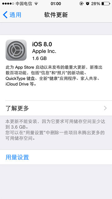 另外,许多用户都遇到了存储空间不足而无法升级iOS8正式版的问题,除了可以通过删除文件来释放空间;大家也可以再等等苹果通过itunes的固件推送。