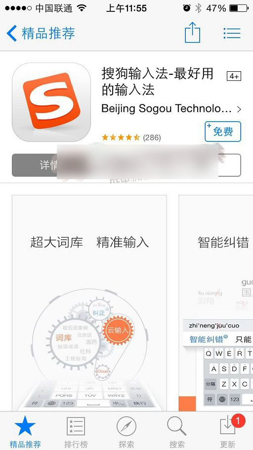 iOS8安装搜狗输入法非常简单,只要点击免费,稍等片刻即可完成安装,安装成功之后,我们去设置输入法,里面就可以切换到搜狗了。