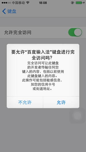7.选择是否要让百度输入法完全访问设备的信息,建议选择允许,这样才能享受输入法完整的功能。