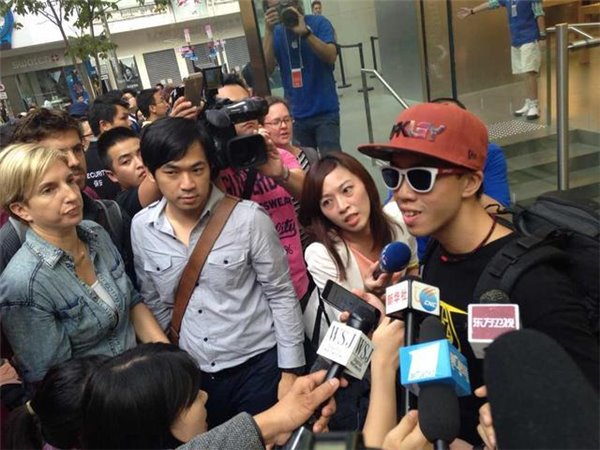 而排在第一位的Hong先生也在8点整的时候,顺利的成为了铜锣湾苹果店首个拿到iPhone新机的用户,当然他也成为了所有媒体的焦点。在采访中Hong表示新的iPhone的大屏幕吸引了他,他并不认为5.5英寸的Plus会不好操作,相反的更大的屏幕可以给他带来更好的视觉体验。
