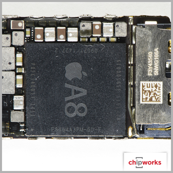 A8 封装底部的标记跟正面的不同。日期代码是 1434,意味着这一芯片从封装工厂运往富士康代工厂,再摆上零售店货架,历时仅 6 周。
